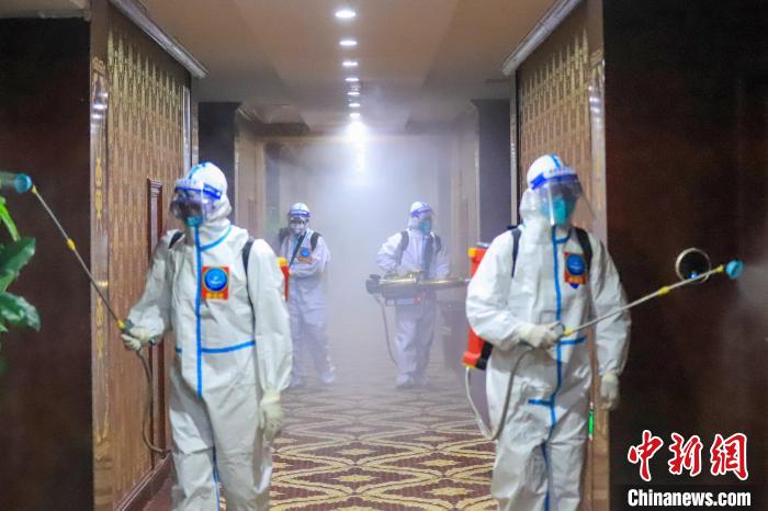 西藏森林消防隊(duì)員對隔離酒店進(jìn)行覆蓋式消殺?!∥鞑厣窒揽傟?duì) 供圖