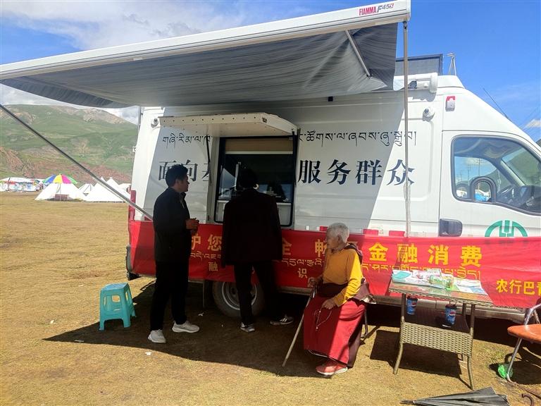 農(nóng)行西藏分行員工輔導(dǎo)客戶使用掌上銀行辦理業(yè)務(wù)。