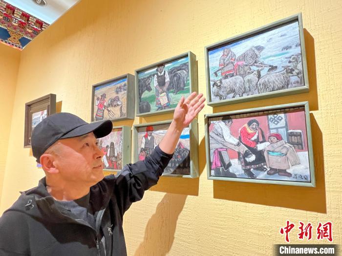 策展人李亞男向中新網(wǎng)記者介紹,崔曉曉首次到西藏那曲便結(jié)識(shí)了一位當(dāng)?shù)嘏笥选麑⑦@位藏族青年放牧、添置汽車、蓋新房等畫面用畫筆記錄了下來,在本次展覽中展出。