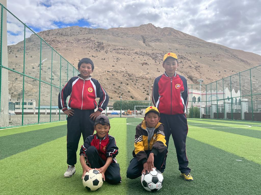 今年6月畢業(yè)前夕,格旦曲桑(前左)和同學(xué)在扎西宗鄉(xiāng)完全小學(xué)的足球場上合影留念