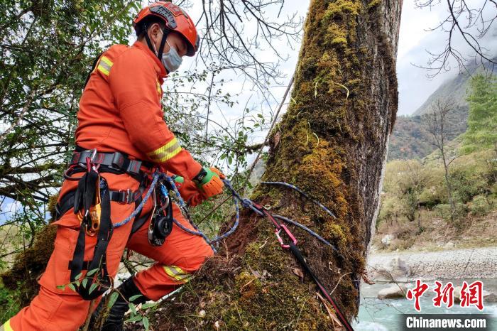 圖為訓(xùn)練現(xiàn)場(chǎng),指戰(zhàn)員制作繩索救援訓(xùn)練支點(diǎn)?!±顕?guó)燾 攝