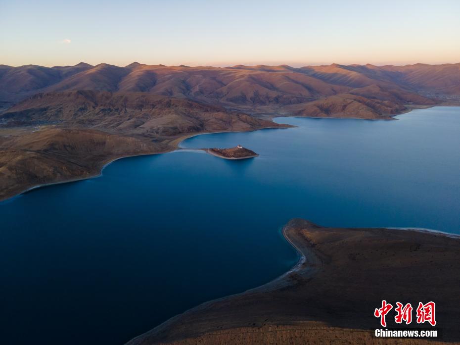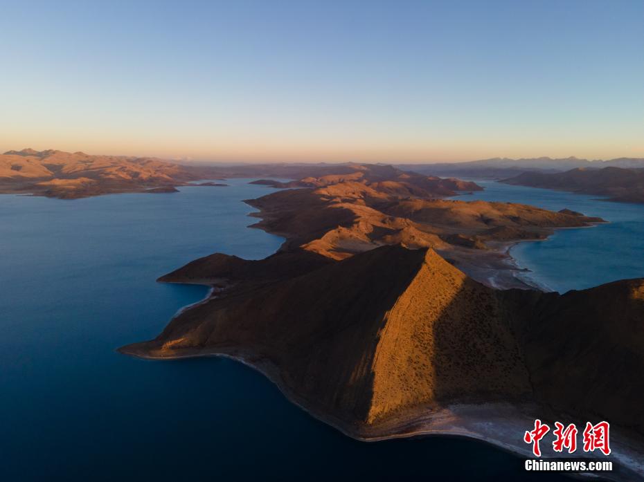 近日,西藏自治區(qū)山南市羊卓雍錯(cuò)(簡(jiǎn)稱羊湖),冬日由于沒有云層遮擋,湖水更顯深藍(lán)、孔雀藍(lán)。航拍視角下,湖水像巨大的寶石鑲嵌于高原大地,風(fēng)光壯麗。羊卓雍錯(cuò)藏語意為“碧玉湖”,湖面海拔4441米,與納木錯(cuò)、瑪旁雍錯(cuò)并稱西藏三大“圣湖”。圖為日落后的羊卓雍錯(cuò)風(fēng)光。 江飛波 攝