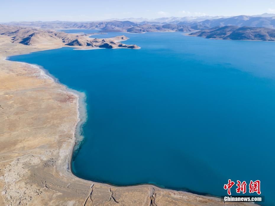 近日,西藏自治區(qū)山南市羊卓雍錯(cuò)(簡(jiǎn)稱羊湖),冬日由于沒有云層遮擋,湖水更顯深藍(lán)、孔雀藍(lán)。航拍視角下,湖水像巨大的寶石鑲嵌于高原大地,風(fēng)光壯麗。羊卓雍錯(cuò)藏語意為“碧玉湖”,湖面海拔4441米,與納木錯(cuò)、瑪旁雍錯(cuò)并稱西藏三大“圣湖”。圖為冬日羊湖湖水呈現(xiàn)為“寶石藍(lán)”。 江飛波 攝