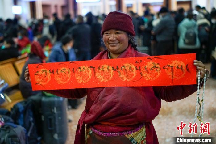 圖為春運(yùn)首日,拉薩火車站一旅客獲得車站送的藏式春聯(lián),上面書(shū)寫(xiě)的是藏語(yǔ)“扎西德勒 吉祥如意”?!〗w波 攝