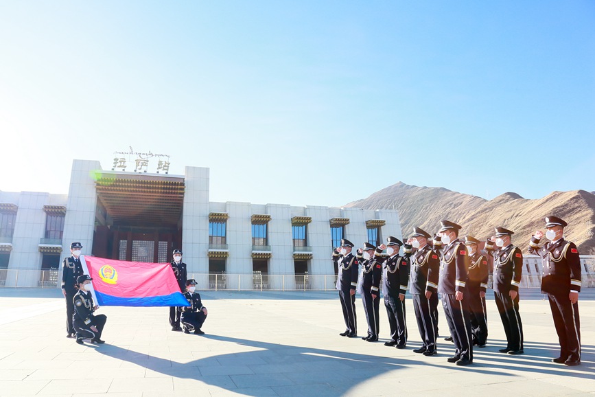 圖為1月9日,拉薩站派出所民警迎著朝陽面向警旗重溫入警誓詞。湯成俊攝