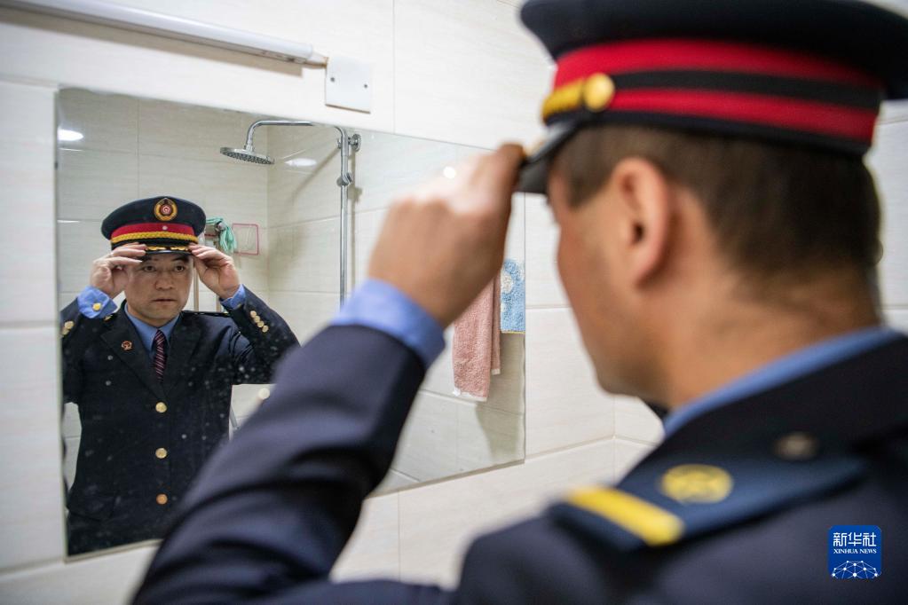 在拉薩機(jī)輛整備中心的宿舍里,黃起崗整理自己的著裝(1月11日攝)。