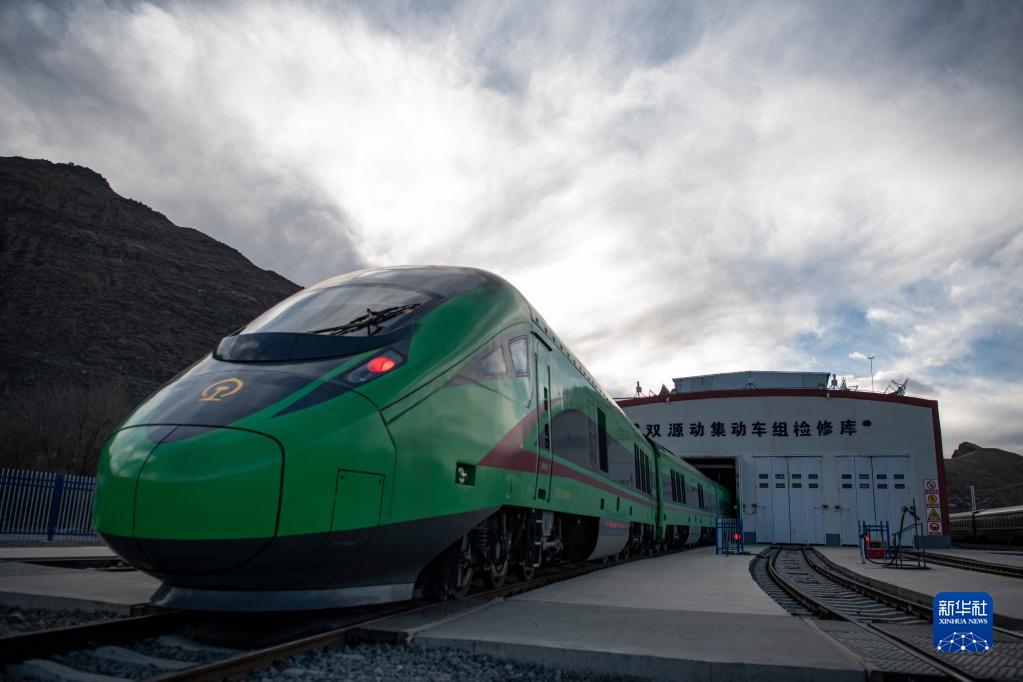 在拉薩機(jī)輛整備中心,動(dòng)車組在檢修庫進(jìn)行整備作業(yè)(1月10日攝)。新華社記者 孫非 攝