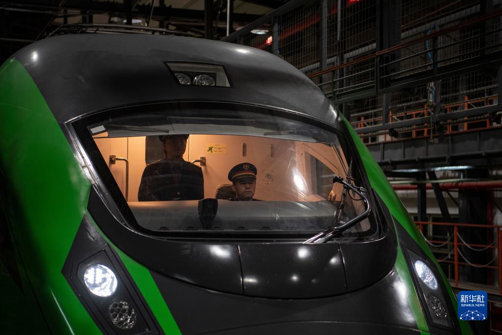 在拉薩機(jī)輛整備中心,黃起崗將動(dòng)車組駛?cè)胪\囄恢茫?月11日攝)。新華社記者 孫非 攝