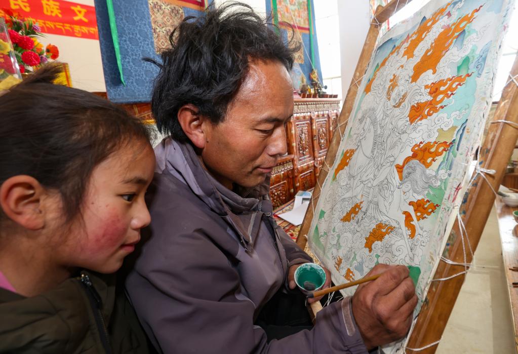 西繞尼瑪認(rèn)為,唐卡繪制不僅要繼承傳統(tǒng)技藝,還要注重時代創(chuàng)新?!艾F(xiàn)在生活這么好,我們要用創(chuàng)新作品來記錄這個時代。”他說,傳承傳統(tǒng)技藝和將時代元素融入創(chuàng)作中,對唐卡技藝來說就像左手和右手一樣重要。
