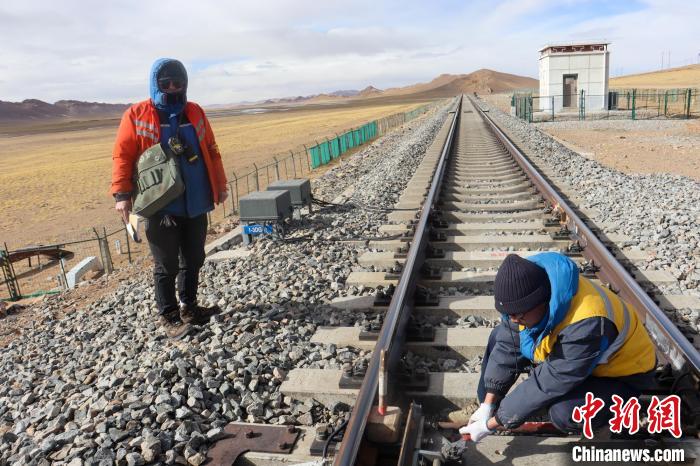 冬季西藏那曲寒風凜冽,工長楊建青(右)加固道岔安裝螺絲?!●R生明 攝