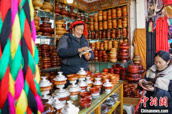 圖為2月13日,拉薩沖賽康市場,商戶阿旺次仁(左)向顧客銷售藏式木碗。中新社記者 江飛波 攝