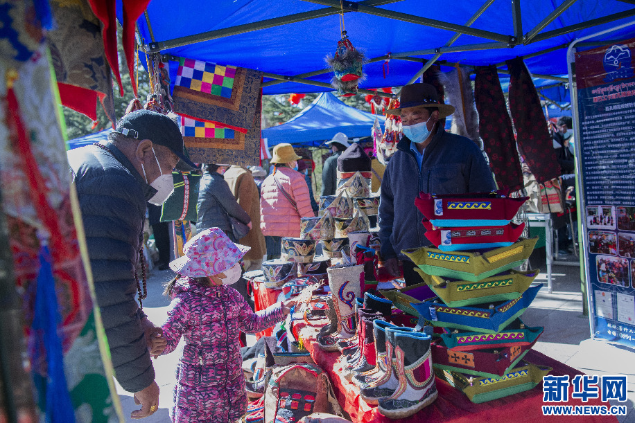 2月14日,群眾在“卓番林”藏族手工藝品牌店展位上挑選特色手工藝品。新華網(wǎng) 旦增努布 攝
