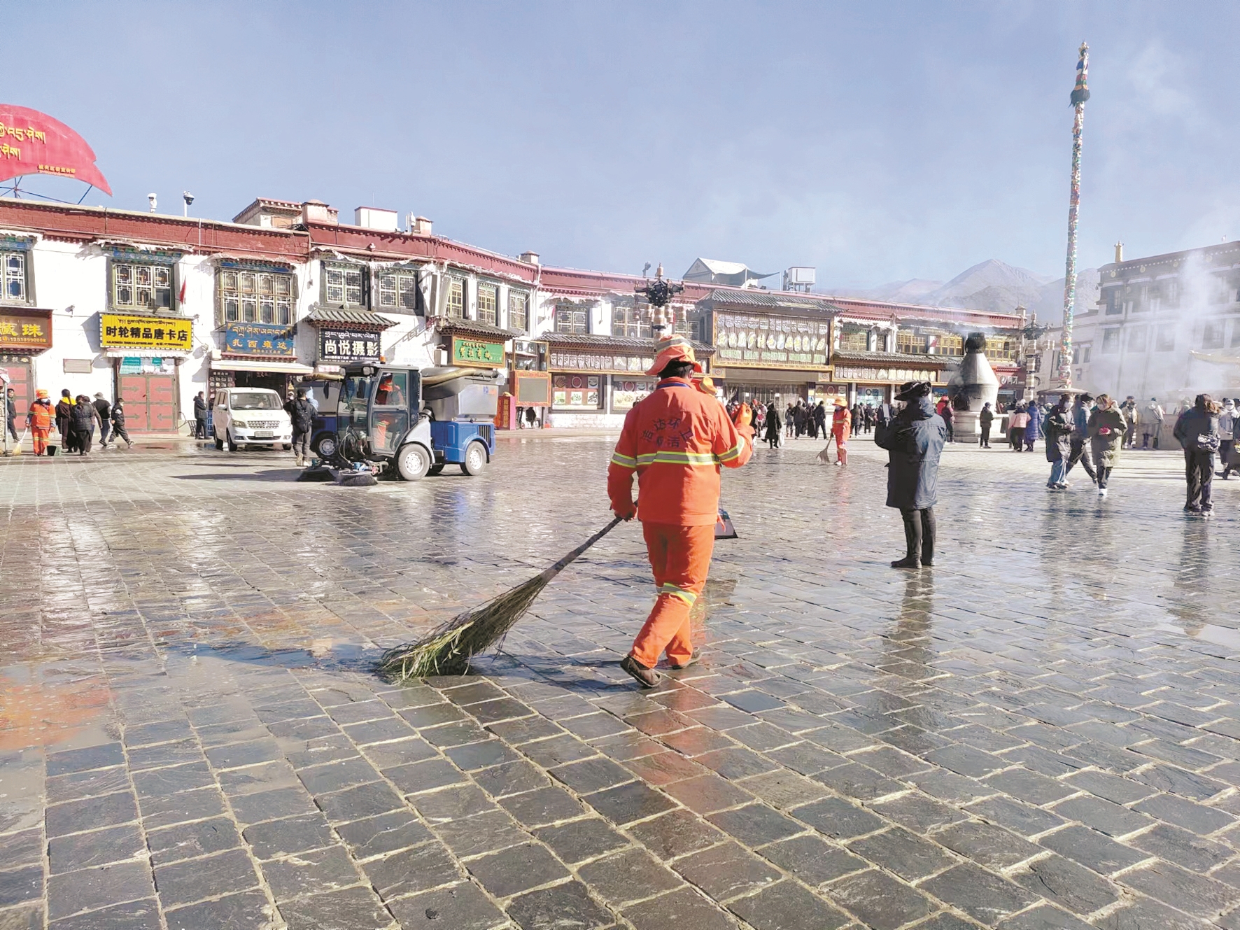 圖為博瑞環(huán)衛(wèi)服務有限公司環(huán)衛(wèi)工人對大昭寺廣場進行清掃、沖洗。 拉薩融媒記者 李從芳攝