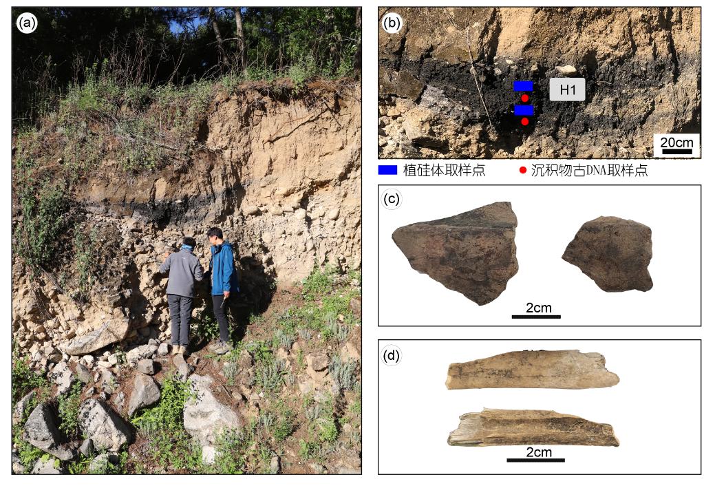 圖(a)孔桑橋遺址調(diào)查剖面圖;圖(b)采樣位置;圖(c)調(diào)查剖面出土陶片;圖(d)調(diào)查剖面出土動(dòng)物骨骼。(資料圖片由聯(lián)合科考隊(duì)提供)