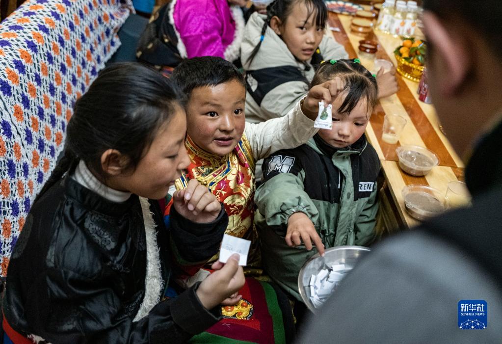 在位于森布日安置點(diǎn)的家中,石秀次仁家的孩子們?cè)谙蚣胰苏故咀约弘S機(jī)拿取的小紙條。畫在紙條上的圖案有著不同的寓意(2月19日攝)。