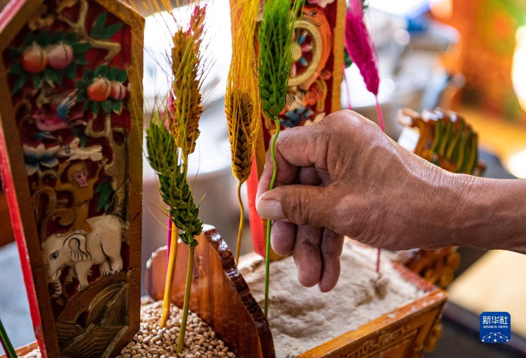 2月20日,在位于西藏拉薩市墨竹工卡縣門巴鄉(xiāng)的家中,扎西次仁用五彩青稞穗裝點(diǎn)象征吉祥的“切瑪”。新華社發(fā)(丁增尼達(dá) 攝)