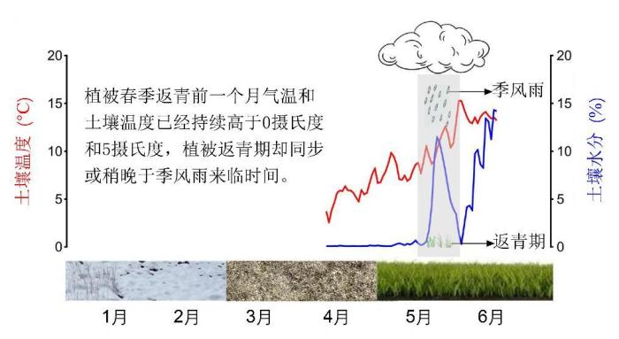 論文第一作者、中科院青藏高原所博士研究生馬鵬飛表示,研究團(tuán)隊(duì)在青藏高原上連續(xù)兩年的實(shí)驗(yàn)觀測數(shù)據(jù)表明:增雨普遍導(dǎo)致紫花針茅、大花嵩草、釘柱委陵菜3個(gè)優(yōu)勢物種返青期提前,而增溫則對其返青期影響不顯著;雖然枯黃期對于溫度和降水均有響應(yīng),但不論是否增溫,增雨都能顯著推遲3個(gè)優(yōu)勢物種枯黃期,且增溫與增雨無交互效應(yīng);3個(gè)優(yōu)勢種返青期同步或稍晚于雨季來臨,春季降水增加使雨季來臨時(shí)間提前進(jìn)而促進(jìn)植被返青。