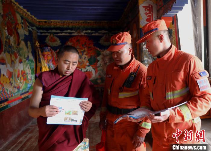 “景區(qū)內(nèi)的宗教寺廟木質(zhì)結(jié)構(gòu)比較多,周圍森林資源豐富,平時(shí)要注意用火安全,防止火災(zāi)發(fā)生?!边@是林芝市森林支隊(duì)消防員正在為德木寺景區(qū)工作人員和僧人宣傳森林消防安全常識。