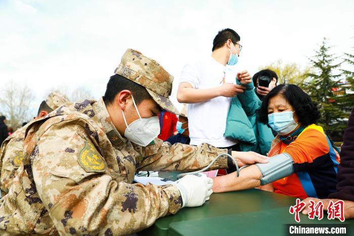圖為官兵為民眾測量血壓?!±_警備區(qū)某團(tuán)供圖