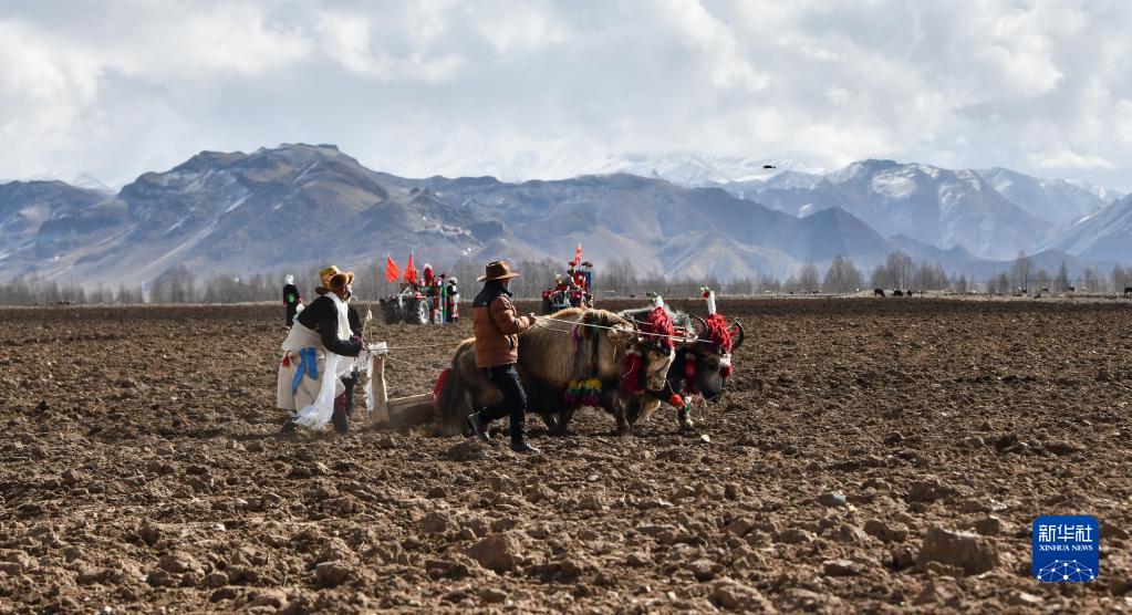 在西藏林周縣強(qiáng)嘎村的春耕儀式上,古老的“二牛抬杠”耕作方式已僅具象征意義(3月16日攝)。新華社記者 晉美多吉 攝