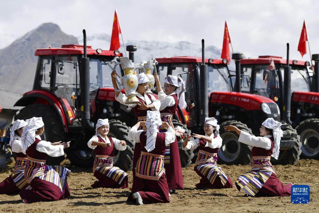 在西藏林周縣強(qiáng)嘎村的春耕儀式上,農(nóng)業(yè)機(jī)械集體亮相(3月16日攝)。新華社記者 張汝鋒 攝