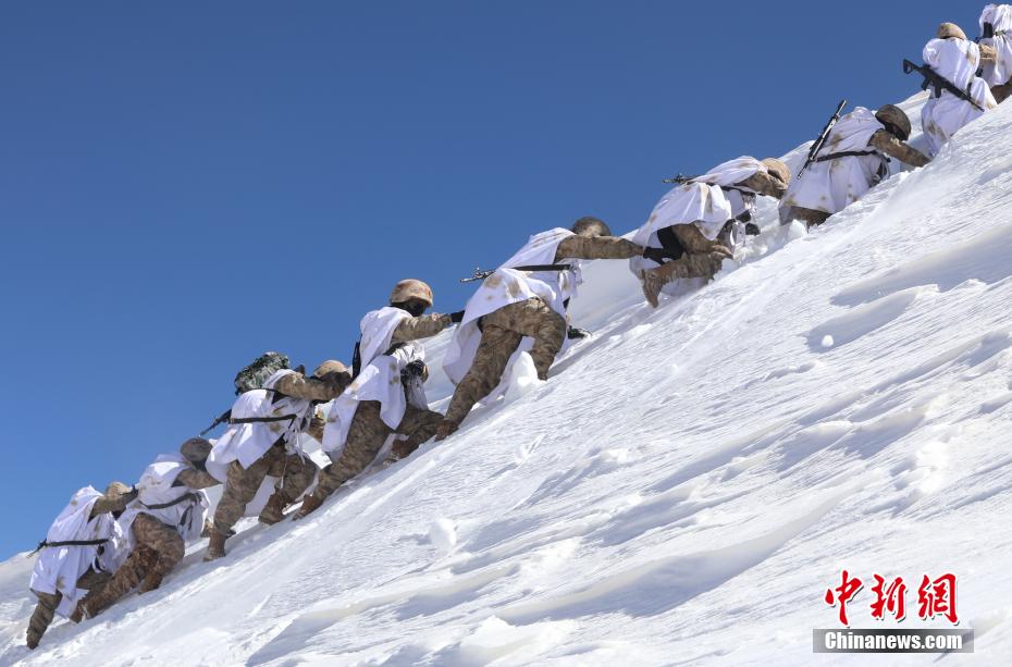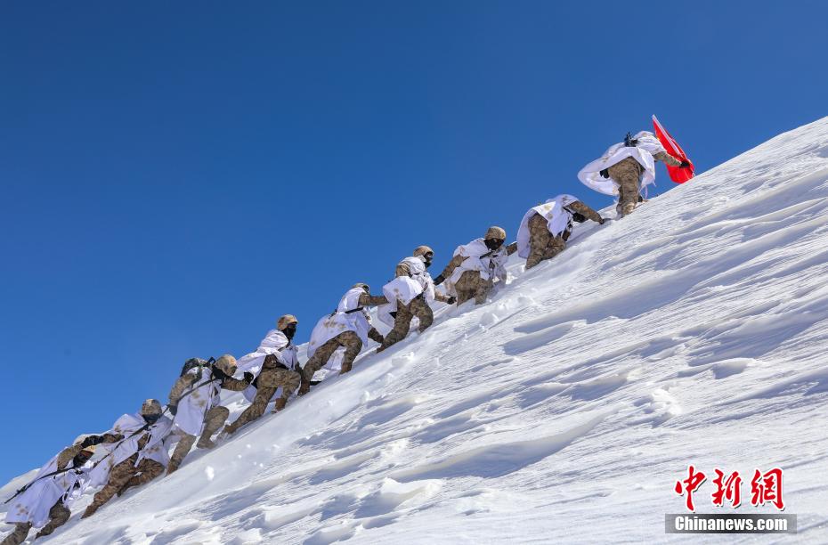 3月21日,阿里軍分區(qū)某邊防團巡邏官兵翻越冰雪達坂向點位前行。李海亮 攝