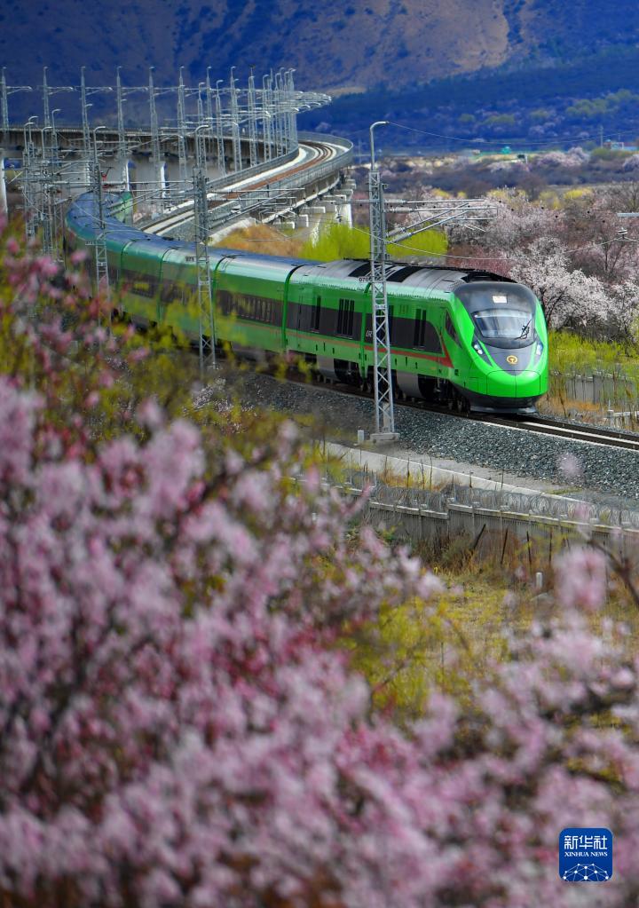 復(fù)興號(hào)穿行在西藏拉林鐵路林芝段的桃花間(2023年3月21日攝)。新華社記者 覺果 攝