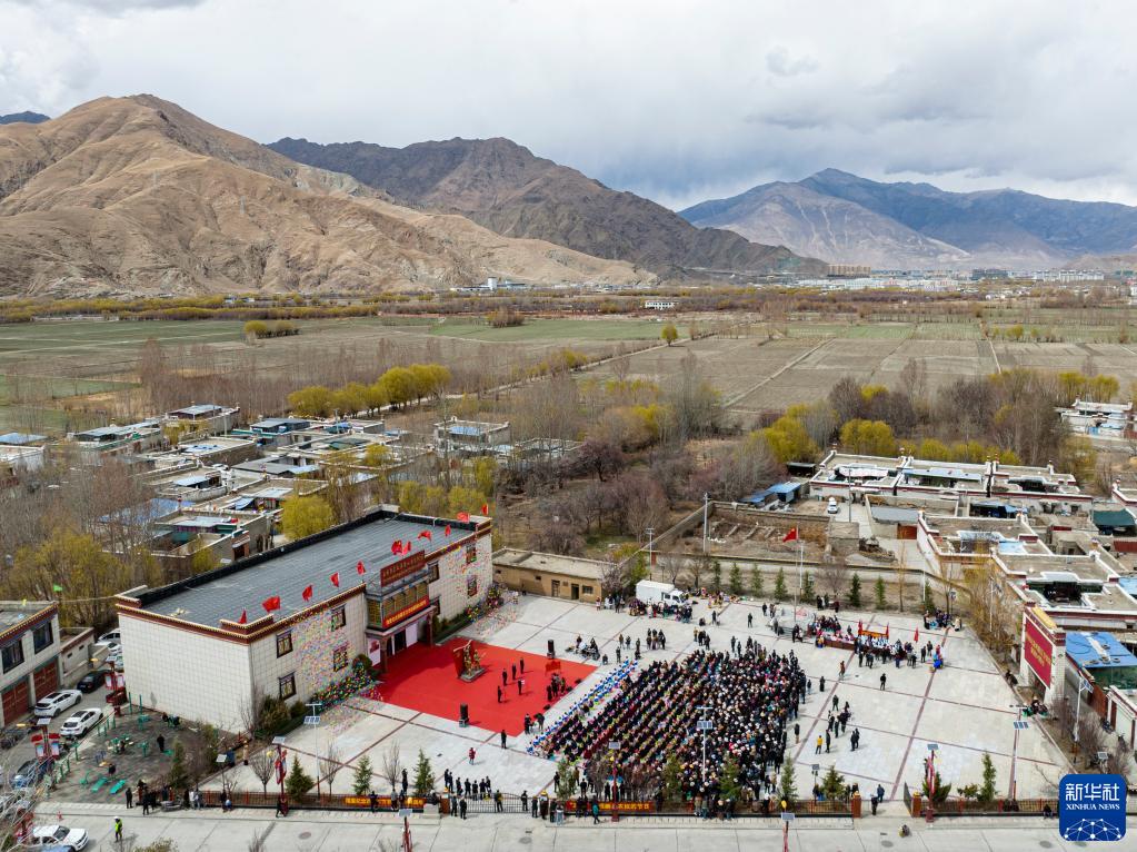 3月28日,在山南市乃東區(qū),西藏民主改革第一村陳列館重新開放,人們在陳列館前舉行儀式,紀(jì)念西藏百萬農(nóng)奴解放64周年(無人機(jī)照片)。新華社記者 孫非 攝