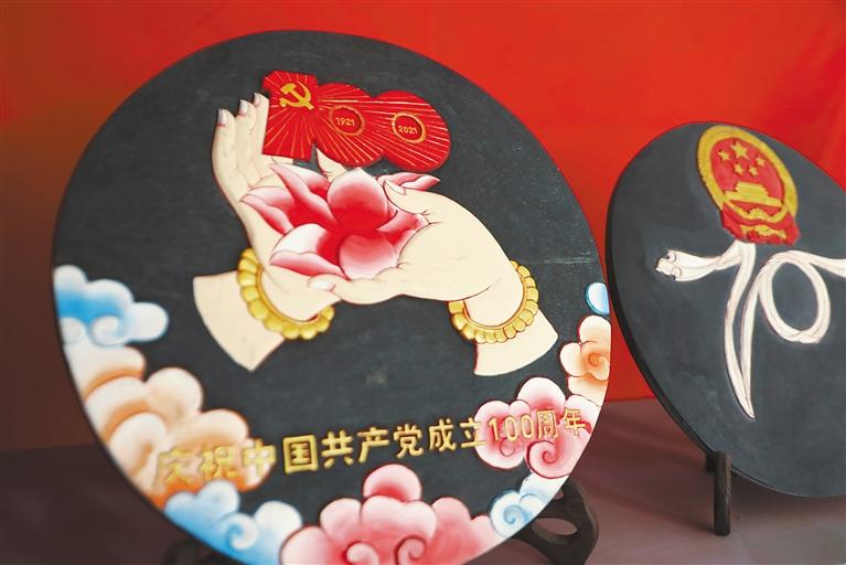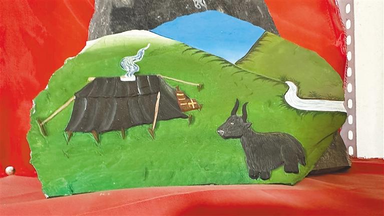 “我們首先要選好一塊石頭,根據(jù)它的形狀和質(zhì)地來決定刻成一幅什么樣的作品,然后再畫出作品的輪廓進(jìn)行雕刻,最后一步則為上色。”桑周才仁熱情地帶我們參觀他的工作室,“慶祝中國共產(chǎn)黨成立100周年”“牧家生活”“扎西德勒”“白海螺”“和氣四瑞像”……每一幅作品活靈活現(xiàn)在大大小小石板上,栩栩如生、惟妙惟肖,堅硬的石頭在他出神入化的雕工下竟變得柔軟,又不失力量和美感。