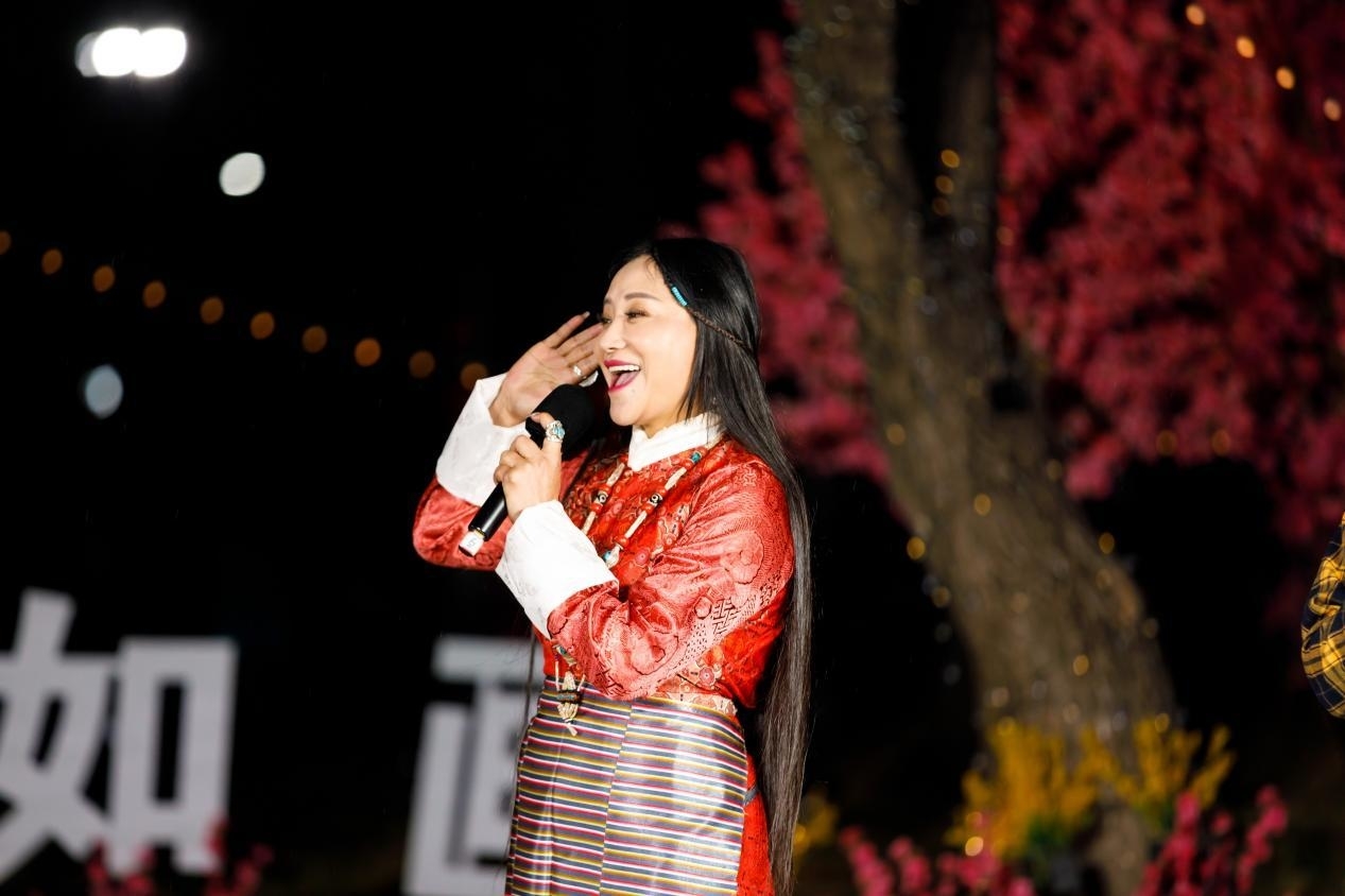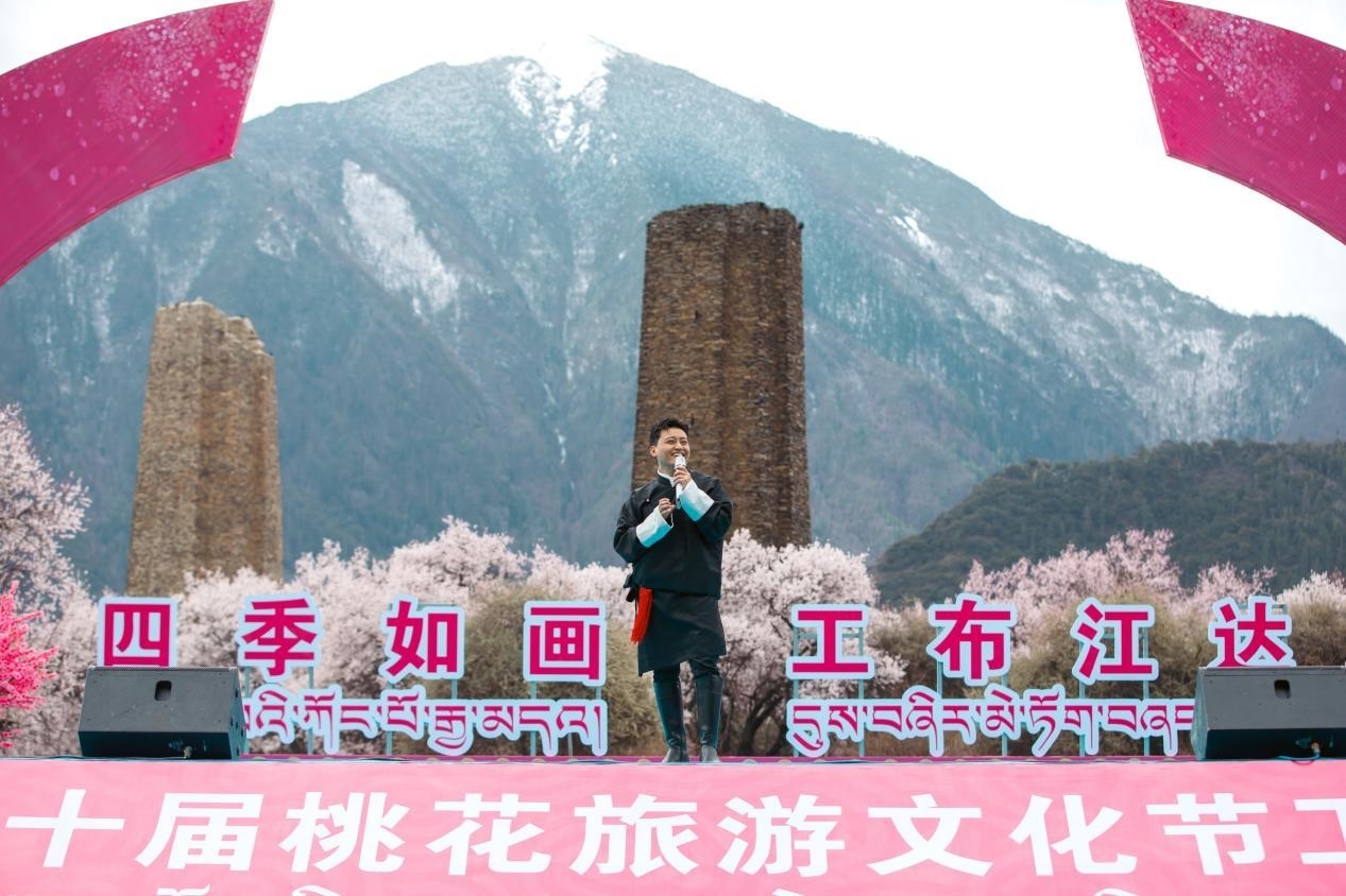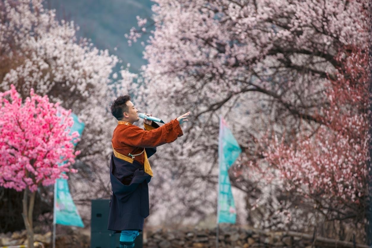 皚皚雪山下,千年古堡旁,灼灼桃花,花開正艷。羅布桑珠、巴金旺甲、齊旦布、桑杰才讓等藏族知名歌手、工布江達(dá)本地歌手、當(dāng)?shù)厝罕婟R聚,流行歌曲與工布民歌等當(dāng)?shù)靥厣硌萁Y(jié)合,為網(wǎng)友們獻(xiàn)上了一場(chǎng)桃花樹下的歌舞盛宴。