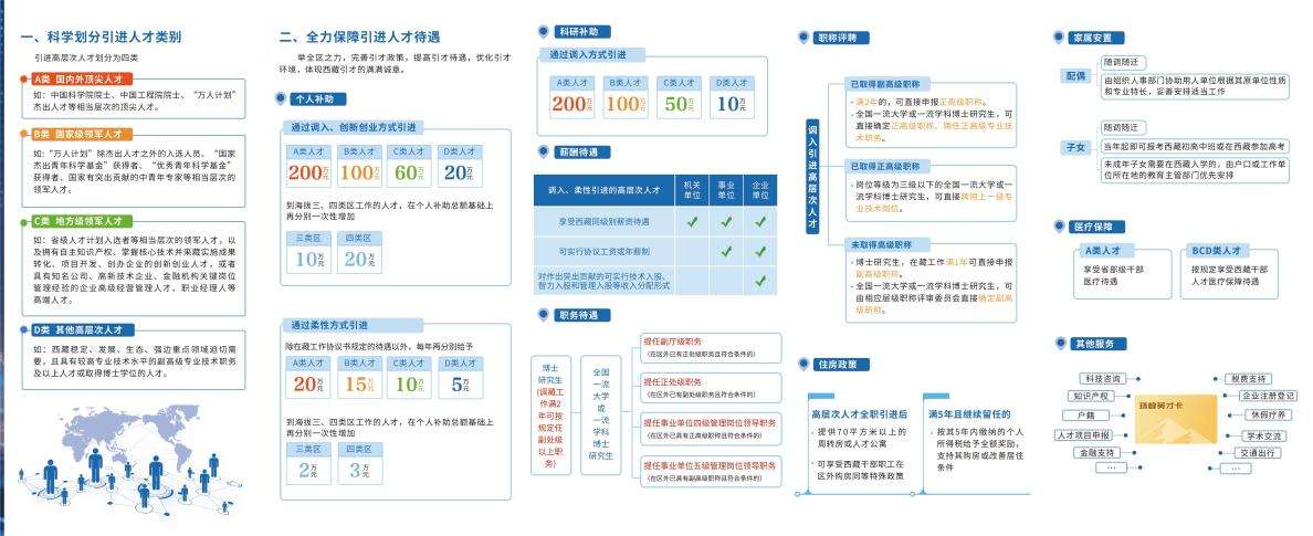 據(jù)悉,近年來(lái),西藏自治區(qū)深入實(shí)施人才“育、引、用、留”四大工程,制定出臺(tái)了《關(guān)于加強(qiáng)和改進(jìn)新時(shí)代西藏人才工作的若干措施(試行)》,科學(xué)劃分引進(jìn)人才類別,將引進(jìn)高層次人才劃分為A、B、C、D四類。在個(gè)人補(bǔ)助、科研補(bǔ)助、薪酬待遇、職務(wù)待遇、職稱評(píng)聘、住房政策、家屬安置、醫(yī)療保障等方面全力保障引進(jìn)人才待遇。同時(shí),千方百計(jì)成就引進(jìn)人才,支持引進(jìn)人才創(chuàng)新創(chuàng)業(yè),激勵(lì)引進(jìn)人才成果轉(zhuǎn)化,實(shí)行配套表彰獎(jiǎng)勵(lì)政策。此外,在簡(jiǎn)化優(yōu)化人才引進(jìn)程序、實(shí)施引才伯樂(lè)激勵(lì)措施方面均有明確政策。
