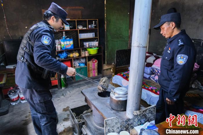 圖為西藏山南移民管理警察向軍(左)在公漳浦執(zhí)勤點為火爐添加風干牦牛糞。 江飛波 攝