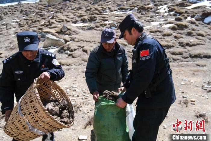 圖為4月6日,公漳浦執(zhí)勤民輔警等在草場收集風干牦牛糞,當作取暖燃料?!〗w波 攝