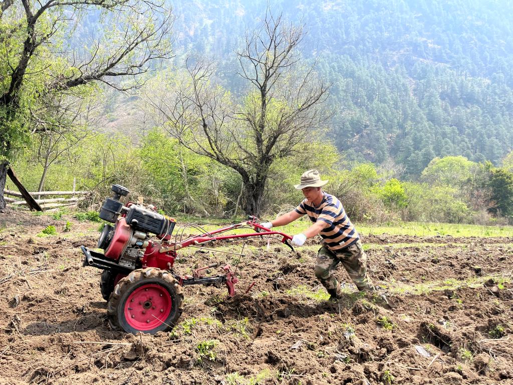 44歲的村民夏多這幾天一刻不得閑,每天一大早,便戴好草帽,穿上膠鞋直奔地里。前些日子剛把水稻田松土澆水完后,緊接著他又一頭扎進玉米地,推著犁地機將田地犁出一道道深深的壟溝?!敖衲晡疫€要幫其他人耕地,13畝多的地得抓緊收拾好,過幾天就要種玉米了。”