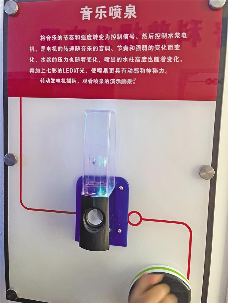 “這個(gè)體驗(yàn)項(xiàng)目叫‘天上來(lái)水’。設(shè)計(jì)者巧妙設(shè)計(jì)水流通過(guò)水泵及透明玻璃管壓入水龍頭內(nèi),在封閉的水龍頭出口處將水溢出管口,溢出的水又將玻璃管隱蔽,水流的循環(huán)造成觀眾難以發(fā)現(xiàn)特殊裝置的奧秘,從而形成人為制造的錯(cuò)覺(jué)?!斌w驗(yàn)結(jié)束后,索央向小朋友解釋“天上來(lái)水”的科學(xué)原理。