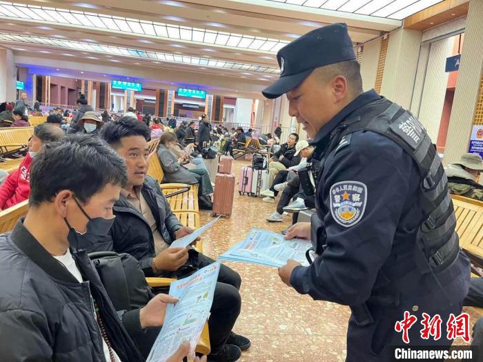 圖為拉薩鐵路公安民警為游客發(fā)放宣傳冊(cè)?!∝暩聛?lái)松 攝