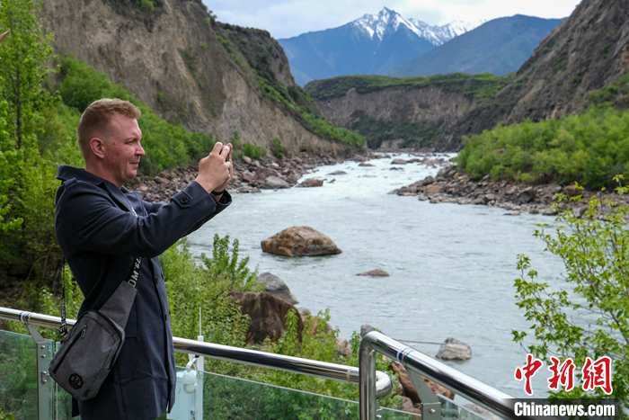 圖為5月16日,參訪團(tuán)成員在雅魯藏布江畔拍照。 中新社記者 江飛波 攝