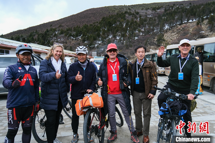 圖為5月17日,參訪團(tuán)成員在林芝魯朗觀景臺與騎行國道318線的旅行者合影。 中新社記者 江飛波 攝