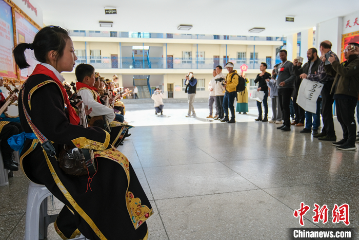進(jìn)入校園后,歡快的扎念琴聲傳來(lái),十多位孩子聚在一起彈奏著。一曲表演完畢,現(xiàn)場(chǎng)掌聲熱烈。