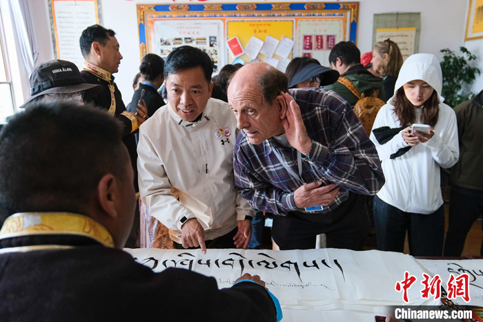 圖為5月18日上午,參訪團(tuán)成員柯馬凱(Michael Crook)側(cè)耳傾聽(tīng)藏文書法老師的講解 中新社記者 江飛波 攝