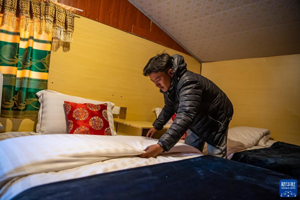 在珠峰游客大本營的帳篷旅館,扎西次仁在整理床鋪(5月13日攝)。新華社記者 晉美多吉 攝