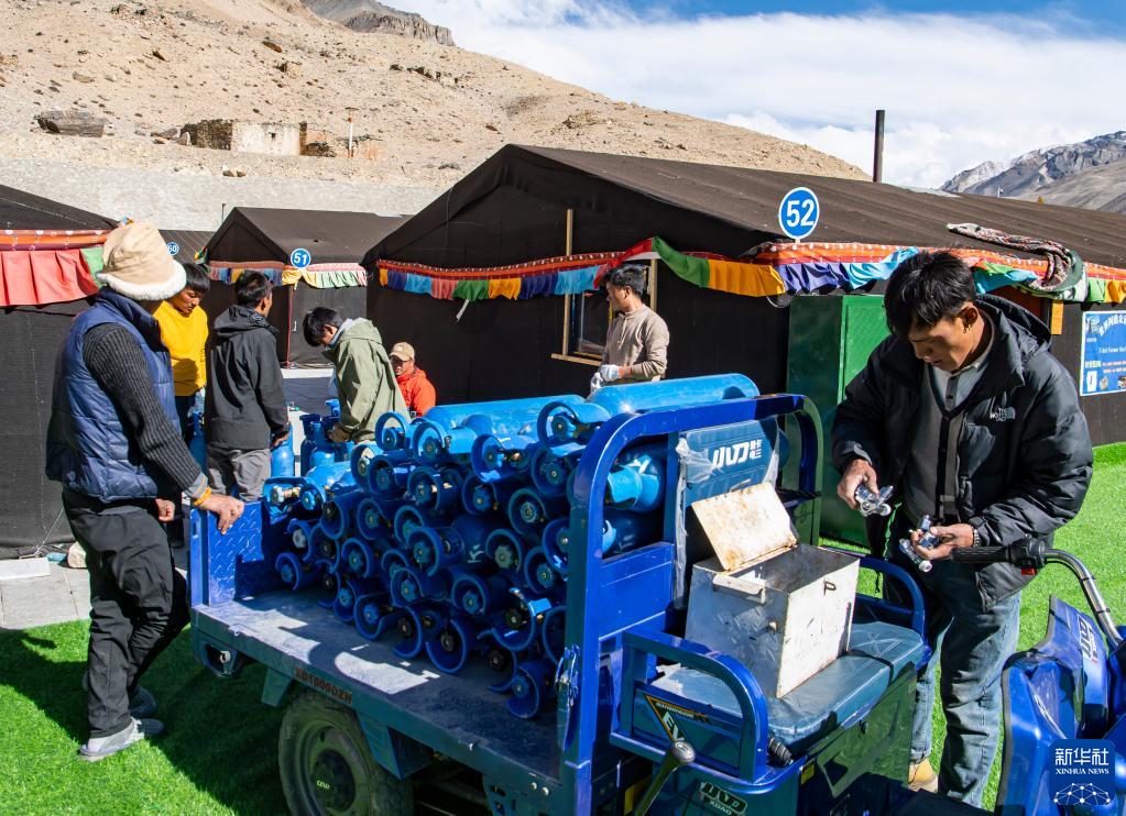 在珠峰游客大本營,工作人員將氧氣瓶送至帳篷旅館(5月13日攝)。新華社記者 孫非 攝