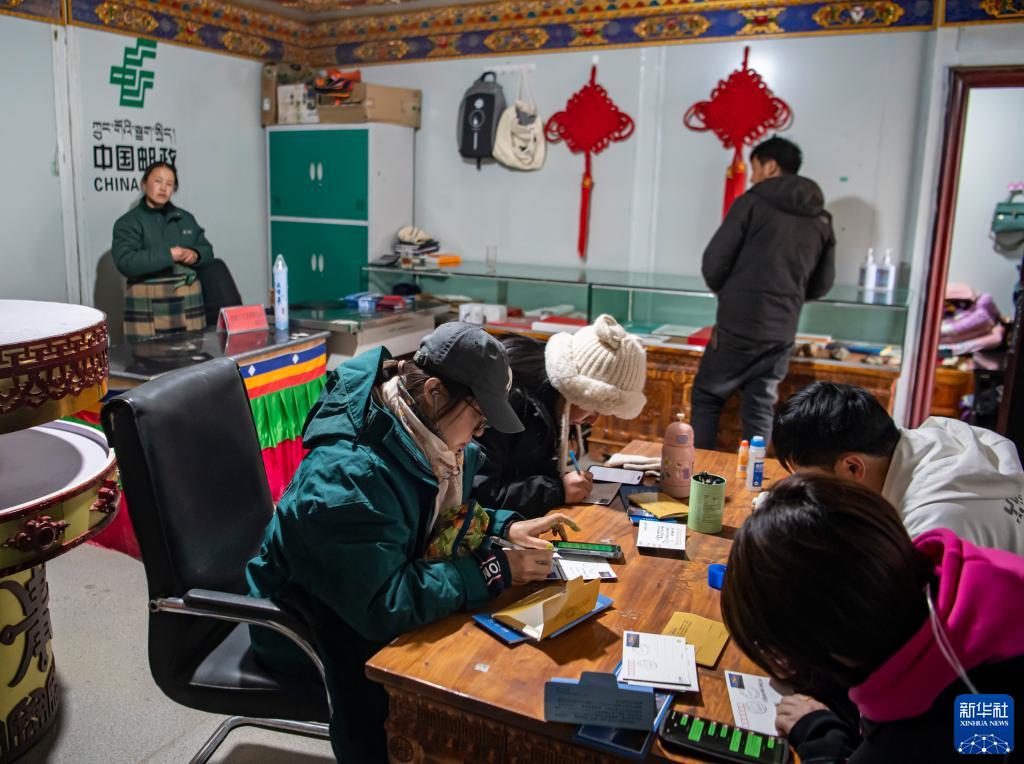 在珠峰游客大本營的郵政所,游客在寫明信片(5月13日攝)。新華社記者 孫非 攝