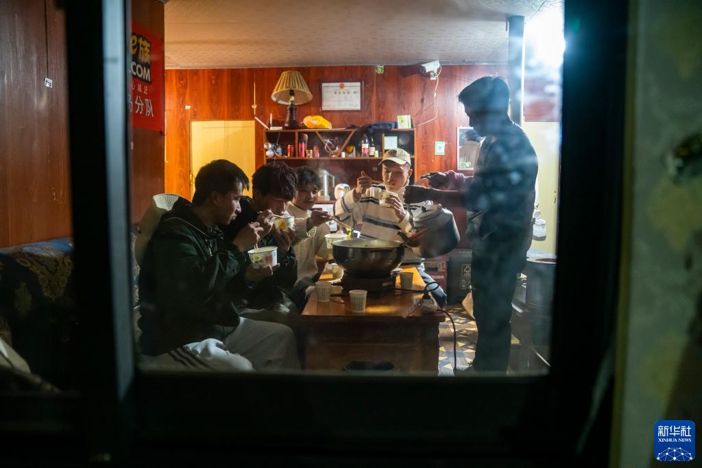 在珠峰游客大本營的帳篷旅館里,旦增(右)為客人的牦牛肉湯鍋里加湯料(5月16日攝)。新華社記者 孫非 攝