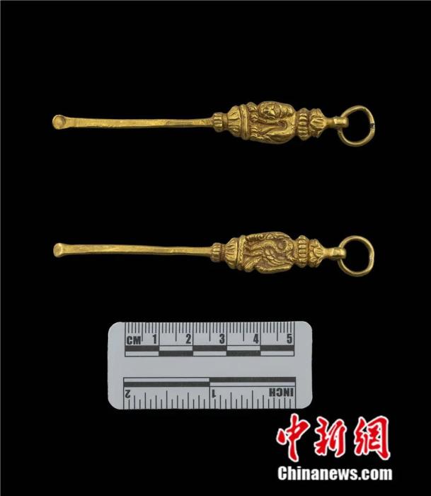 西藏自治區(qū)拉薩市當雄縣當曲卡鎮(zhèn),當雄墓地出土的雄獅鳥紋金耳勺。國家文物局供圖