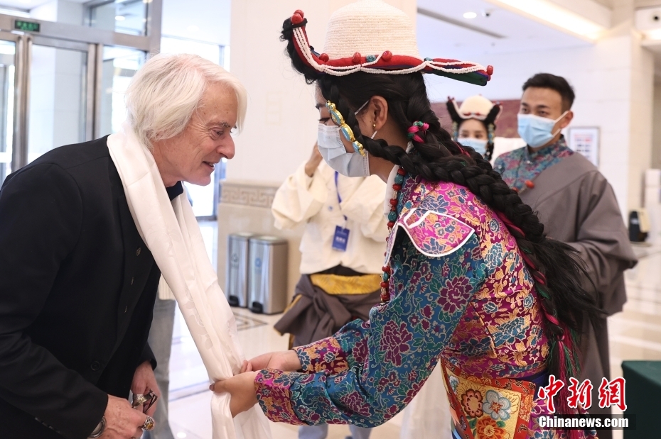 5月23日,“2023·中國(guó)西藏發(fā)展論壇”在北京舉行。會(huì)場(chǎng)外,活潑獨(dú)特的藏式迎賓舞蹈、展示西藏人文自然風(fēng)貌的圖片,已在論壇開(kāi)幕前預(yù)熱起探討西藏新發(fā)展的氛圍。圖為著名紀(jì)錄片導(dǎo)演、全球化智庫(kù)(CCG)高級(jí)研究員龍安志(Lawrence Brahm)接受哈達(dá)。