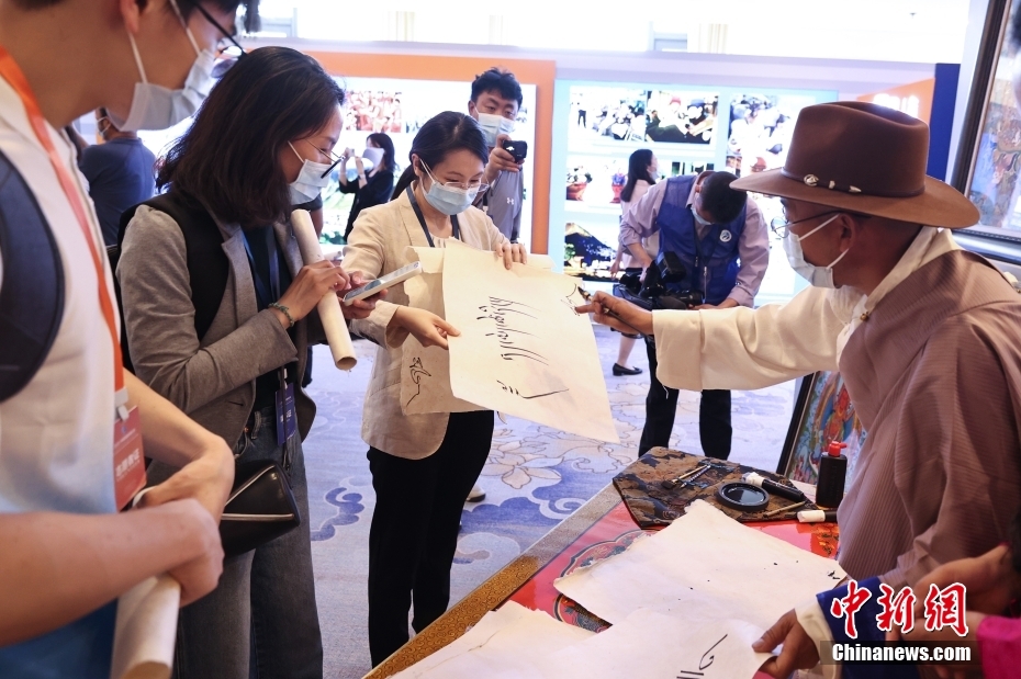 5月23日,“2023·中國(guó)西藏發(fā)展論壇”在北京舉行。會(huì)場(chǎng)外,活潑獨(dú)特的藏式迎賓舞蹈、展示西藏人文自然風(fēng)貌的圖片,已在論壇開(kāi)幕前預(yù)熱起探討西藏新發(fā)展的氛圍。圖為藏族藝人現(xiàn)場(chǎng)進(jìn)行藏文書(shū)法創(chuàng)作并將作品贈(zèng)送給來(lái)賓。