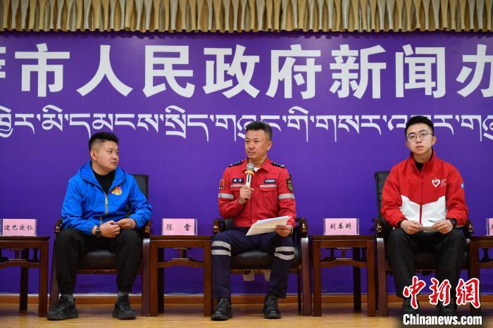 圖為拉薩市青年志愿救援隊代表陳雷(中)正在分享志愿服務(wù)經(jīng)歷。 貢嘎來松 攝