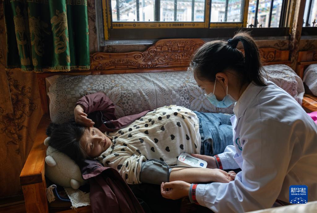 6月12日,陳冰醫(yī)生(右一)在給產(chǎn)婦扎西央宗做產(chǎn)檢。新華社記者 邵澤東 攝