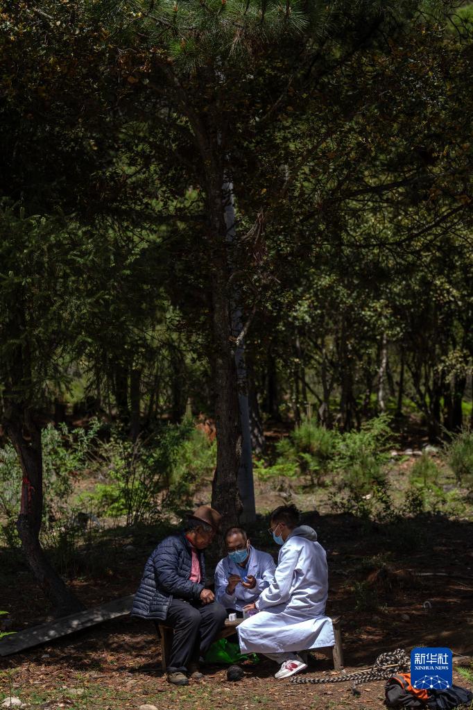 6月12日,在距離吞不絨村幾公里的路旁的樹下,王振疆醫(yī)生(右二)和尼瑪益西醫(yī)生(右一)在給普布多吉檢查身體。新華社記者 晉美多吉 攝